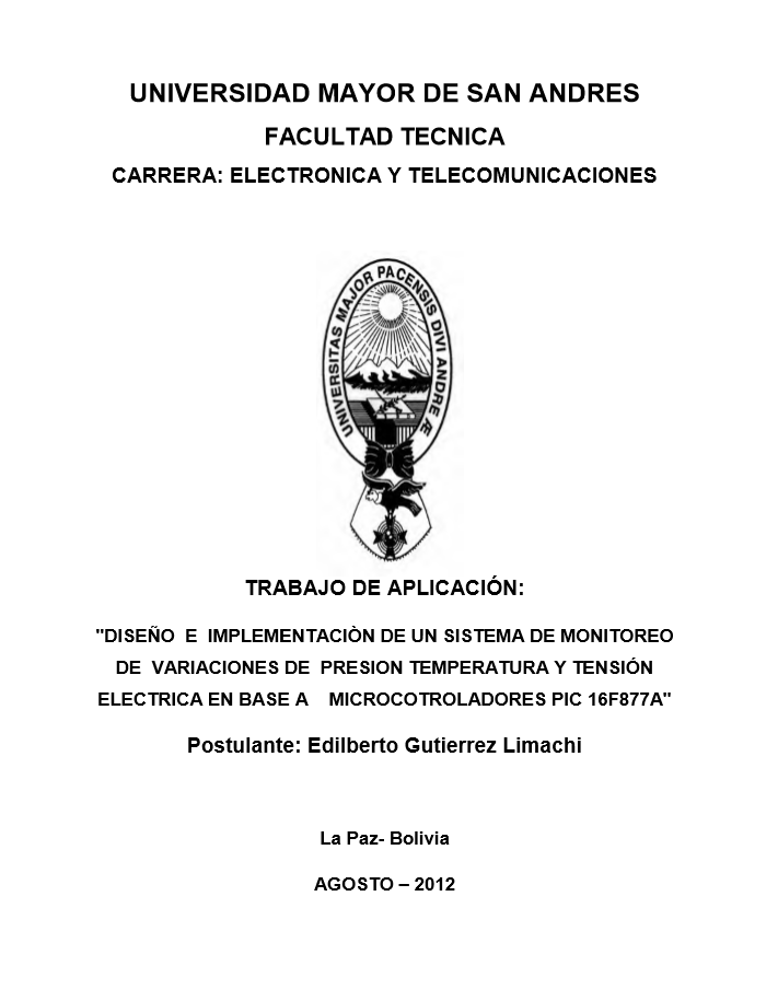 Este sistema de control está diseñado en base al microcontrolador Pic 16F877A fabricado por Microchip, este chip tiene muchas herramientas incluidas, de las cuales vamos a usar el conversor Análogo Digital aplicando tres canales, An0, An1, An3 para la conversión de parámetros físicos como ser la temperatura, la presión relativa de aire comprimido aplicado a circuitos o redes neumáticas y por último la tensión eléctrica entre dos líneas L1 y L2 de una instalación trifásica 220 AC, pero para fines demostrativos se medirá la tensión eléctrica de cualquier instalación eléctrica domiciliaria, para posteriormente digitalizar estos tres parámetros y mostrarlos por un display de cristal líquido LCD. Este sistema estará leyendo constantemente las tres variaciones físicas y mostrándolo en caracteres alfanuméricos en el LCD. Para corregir y disminuir el error en la resolución del conversor A/D utilizaremos amplificadores operacionales, el circuito integrado LM 324N. Hasta ahora este sistema es útil, nos muestra valores reales con un pequeño margen de error esto implicaría que el usuario tendría que estar constantemente observando el display para leer la información y tomar decisiones, lo que se pretende con este proyecto es observar la variación de uno de estos parámetros en función al tiempo, ejemplo, queremos saber cómo ha sido el comportamiento de la temperatura en el lapso de 1hora, para lograr este objetivo vamos a tomar el parámetro, lo vamos a digitalizar para mostrarlo por el display LCD y también mandaremos este dato a un computador personal mediante el puerto serial RS232 que es otra de las herramientas que pertenece al módulo USART del microcontrolador PIC, En el computador estará corriendo un programa diseñado en Visual Basic configurado para la comunicación serial de manera que.guarde los valores enviados por PIC, tomando en cuenta el tiempo para almacenarlos y posteriormente mostrarlo en un gráfico por ejemplo temperatura en grados centígrados versus tiempo en segundos o presión versus tiempo, y por último tensión eléctrica versus tiempo. La finalidad de este proceso es de poder grabar el comportamiento de una de estas tres variables físicas, una a la vez y graficarlas con el fin de ver su comportamiento en un tiempo determinado, esta grafica nos sirve de mucha ayuda en la comprensión del comportamiento para que posteriormente se tome decisiones de forma correctiva si es que se ha detectado alguna anomalia.